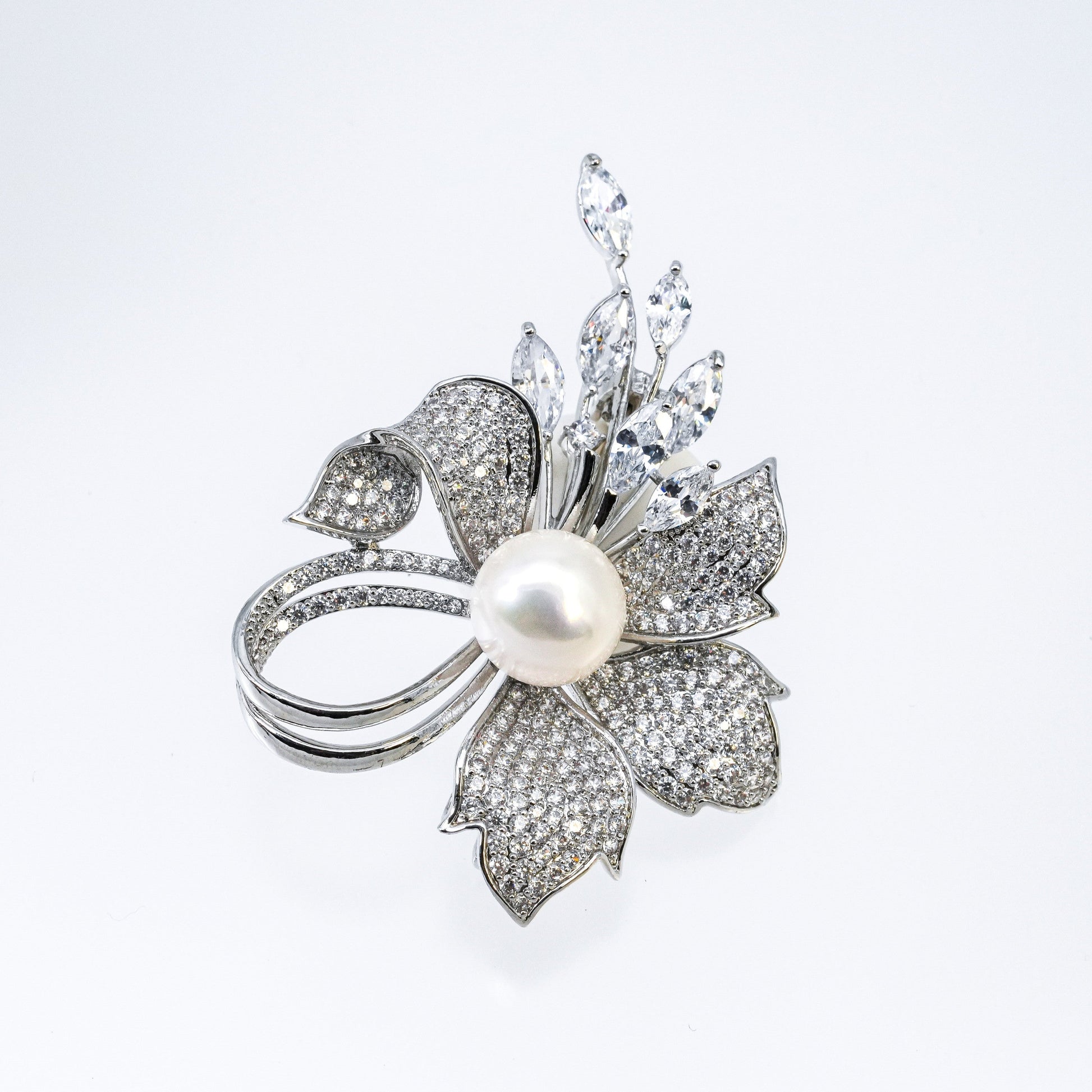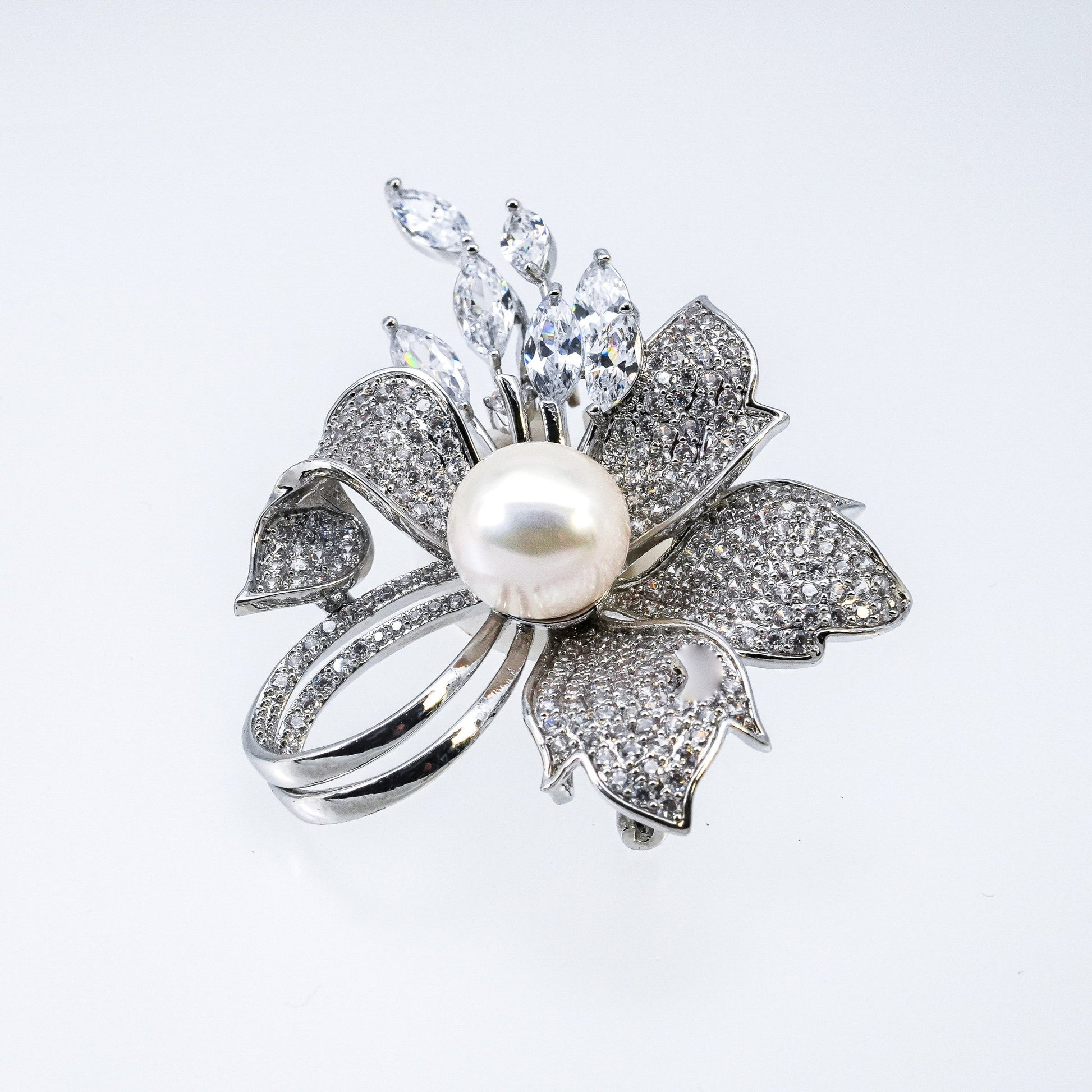 花モチーフがキラキラと輝き、中心に天然淡水真珠があしらわれた上品なデザインのアクセサリーです。ツーウェイ仕様で、ネックレスとしてもブローチとしてもお使いいただけます。華やかさと艶やかさを演出します。