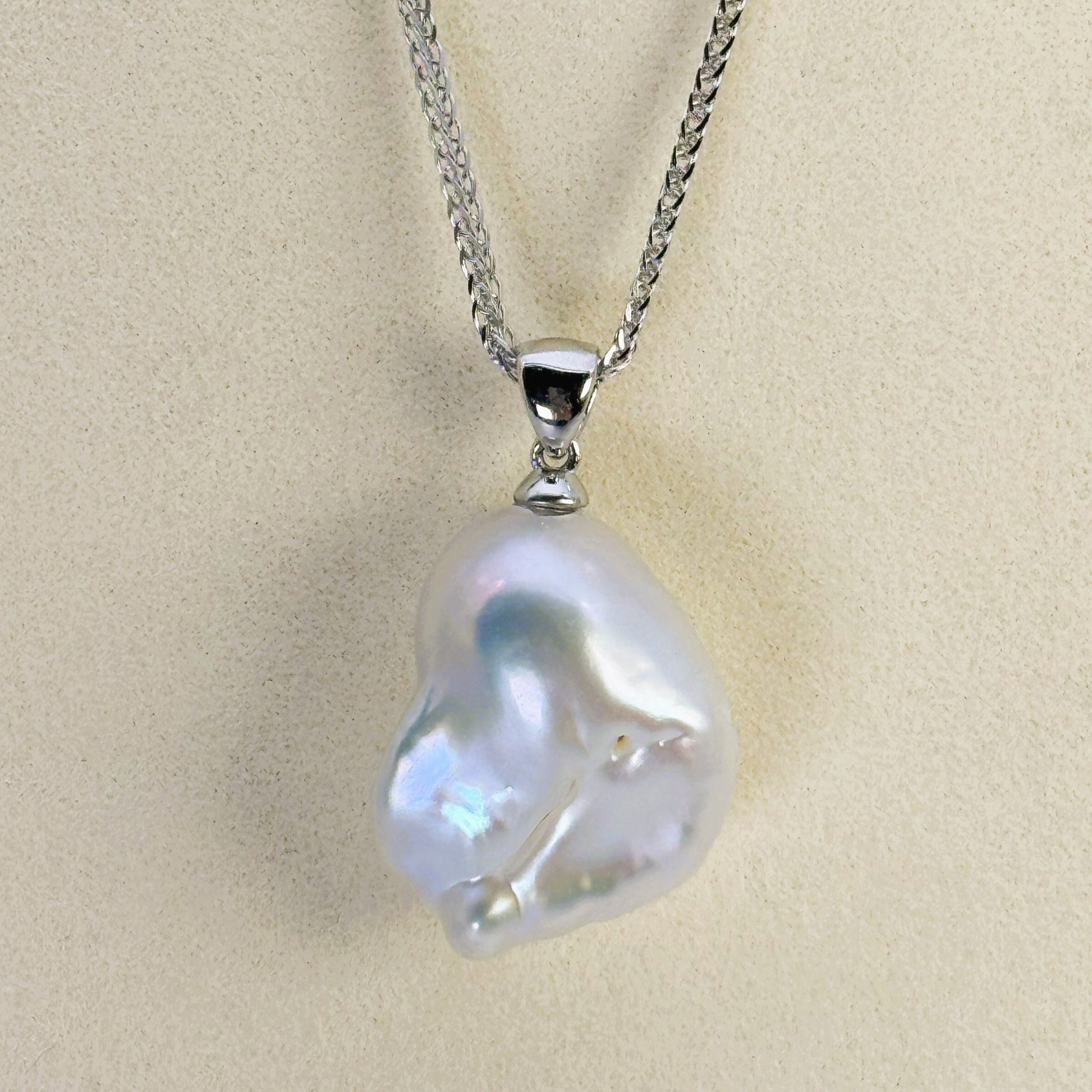 淡水バロックパールのペンダントトップ。16.0mmから19.0mmの幅で、ひとつひとつ異なる個性が魅力です。ホワイトの輝きが上品に首元を彩り、洗練された大人のスタイルを引き立てます。日常から特別なシーンまで幅広くお使いいただける逸品です。