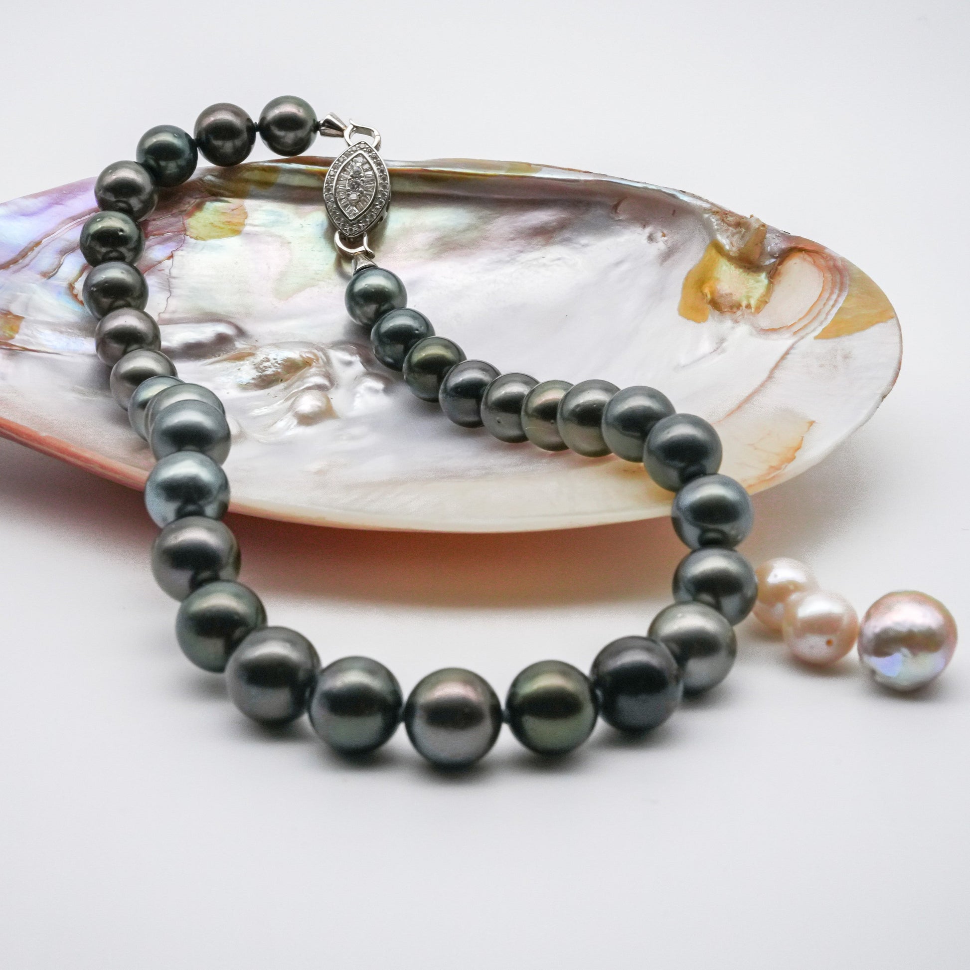 ネックレスは、黒蝶パールの虹色のつやが美しい一生物のアクセサリーです。重厚感と気品を兼ね備え、ステータスや上品さを演出します。身に着けることで、高級感のある魅力的な印象を与えることができます。