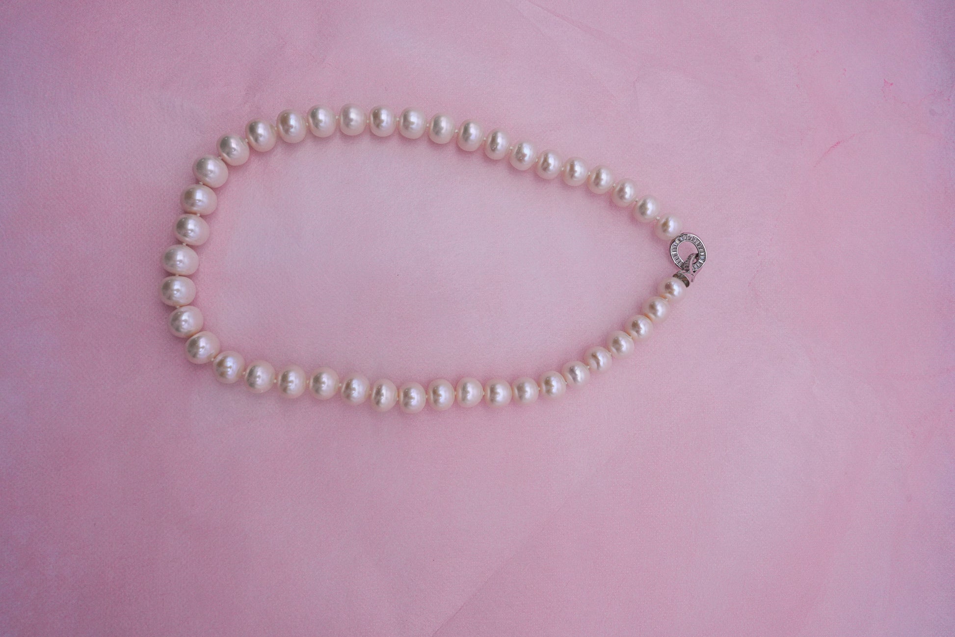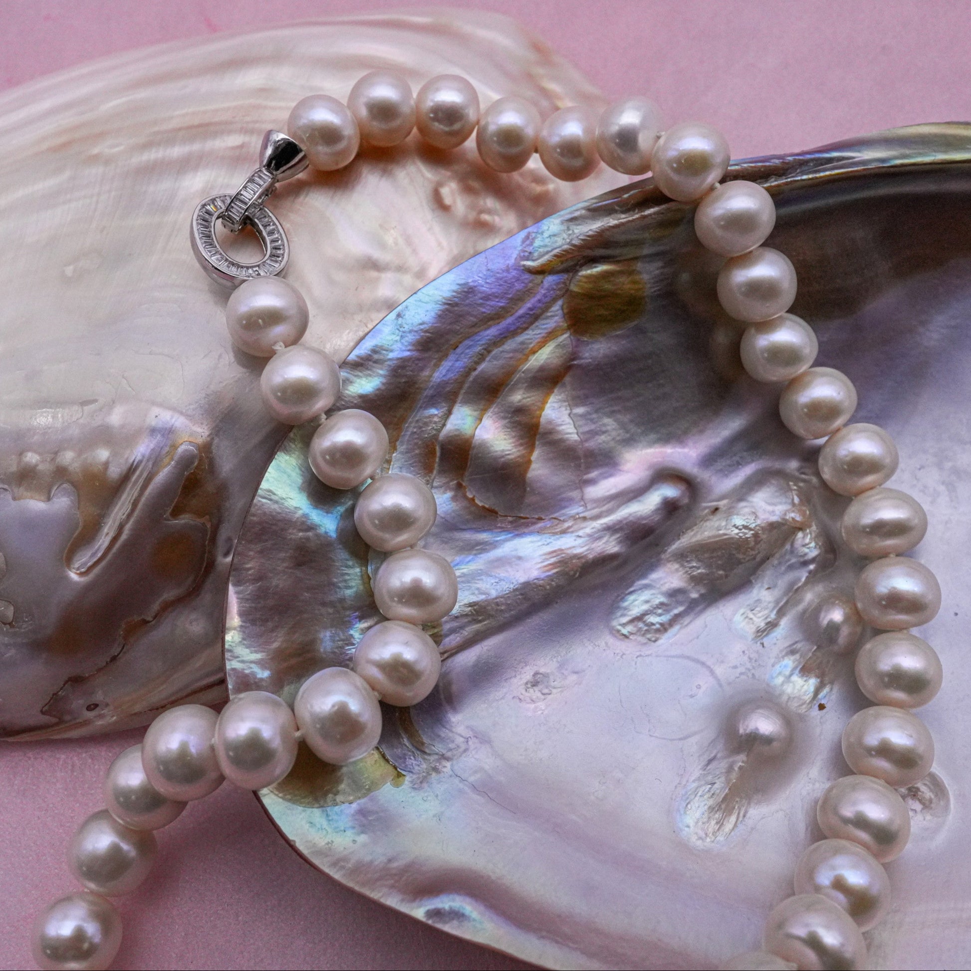 上品なピンク色の淡水真珠(10.0mm~11.0mm)をあしらったネックレス。繊細なシルバーの土台が真珠の美しさを引き立て、洗練された印象を演出します。普段使いから特別な場面まで、女性らしい優雅さを添える一品です。