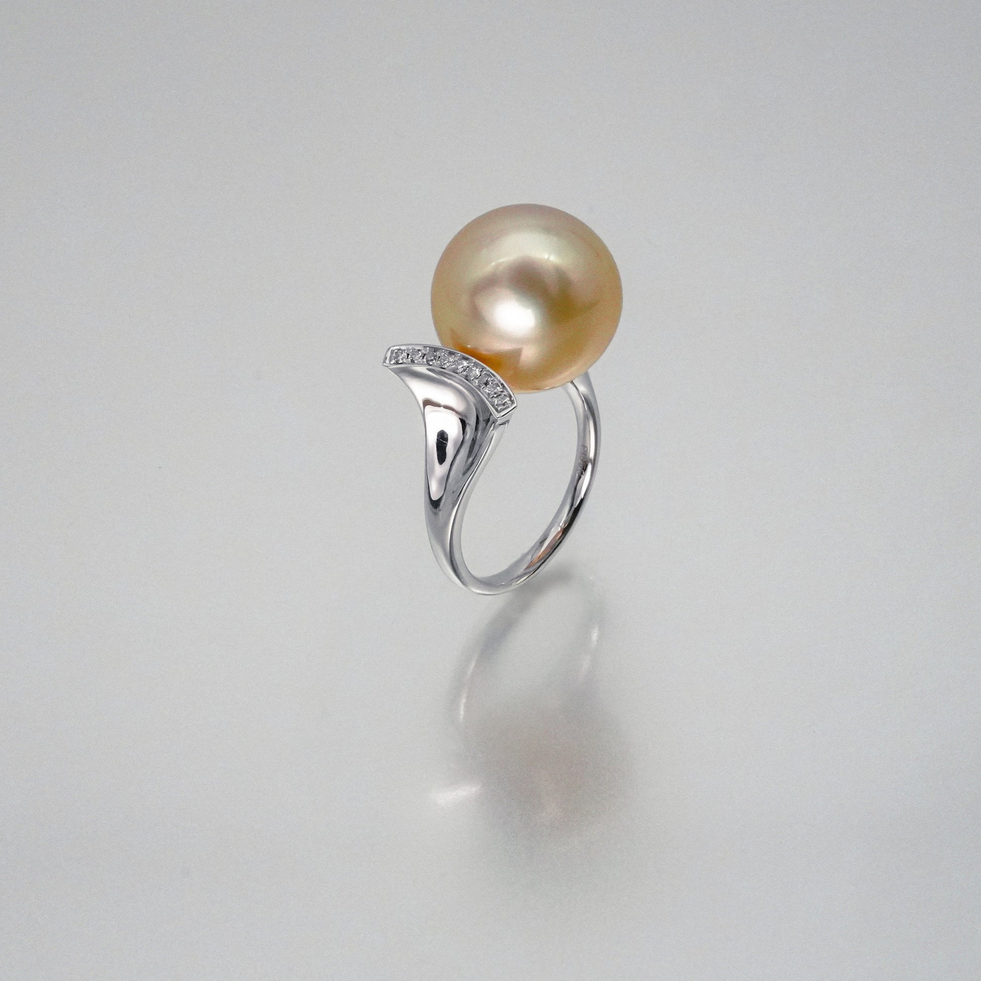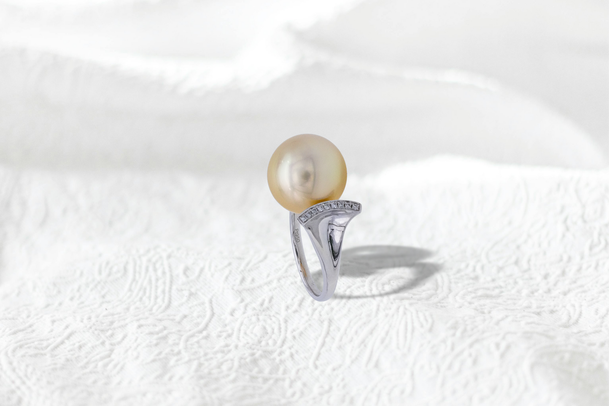 深みのある黄金色の光沢が魅力のゴールデンパールを一粒あしらったリング。パールの丸みに沿うように添えられたジルコニアが、やわらかく女性らしい雰囲気を演出します。