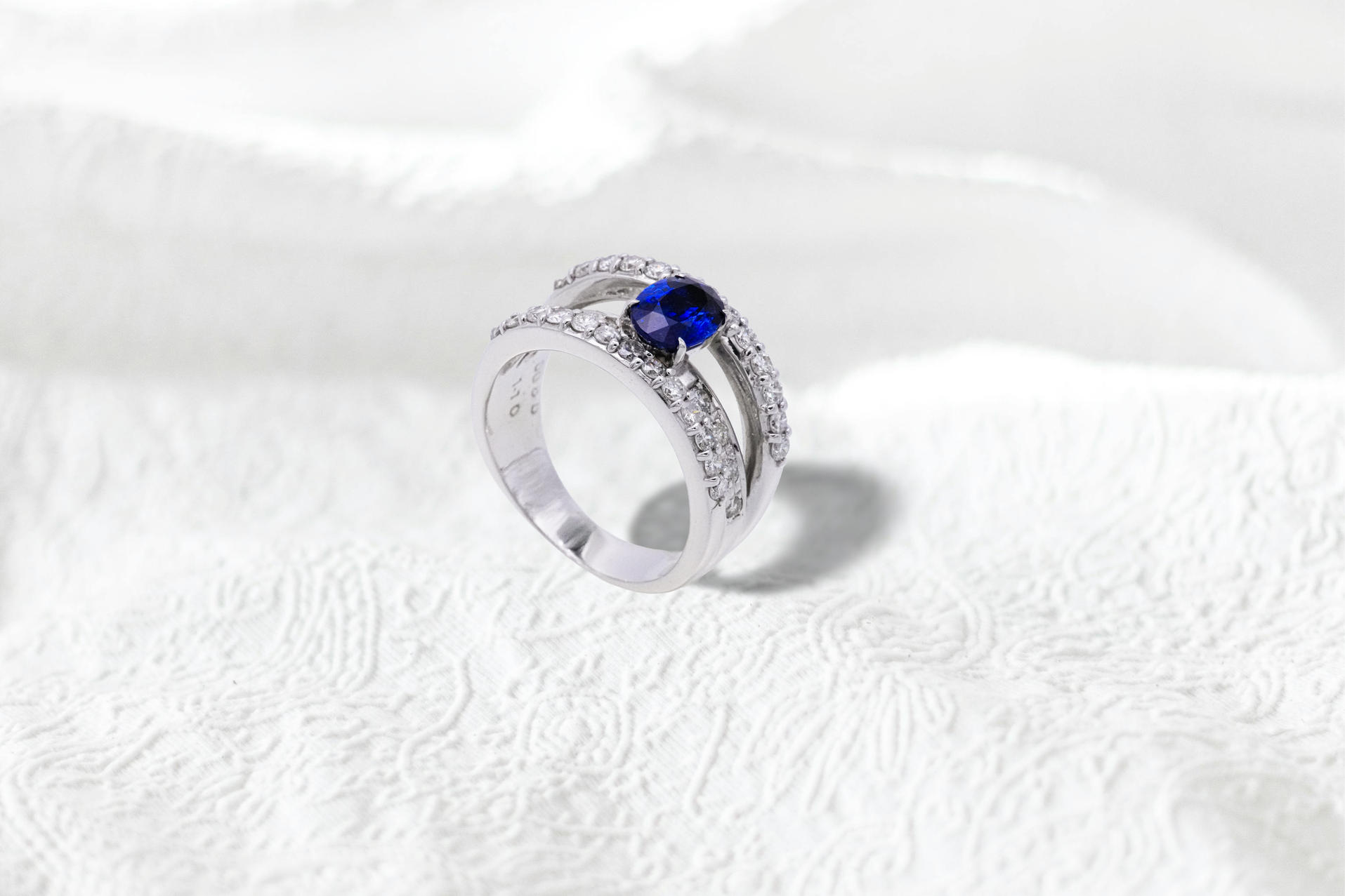 立体感のある3段デザインが、どの角度から見ても美しく、指先に構築的な印象を与えます。中央のサファイアはクラシカルでありながら、現代的なリングデザインにより都会的な印象に。