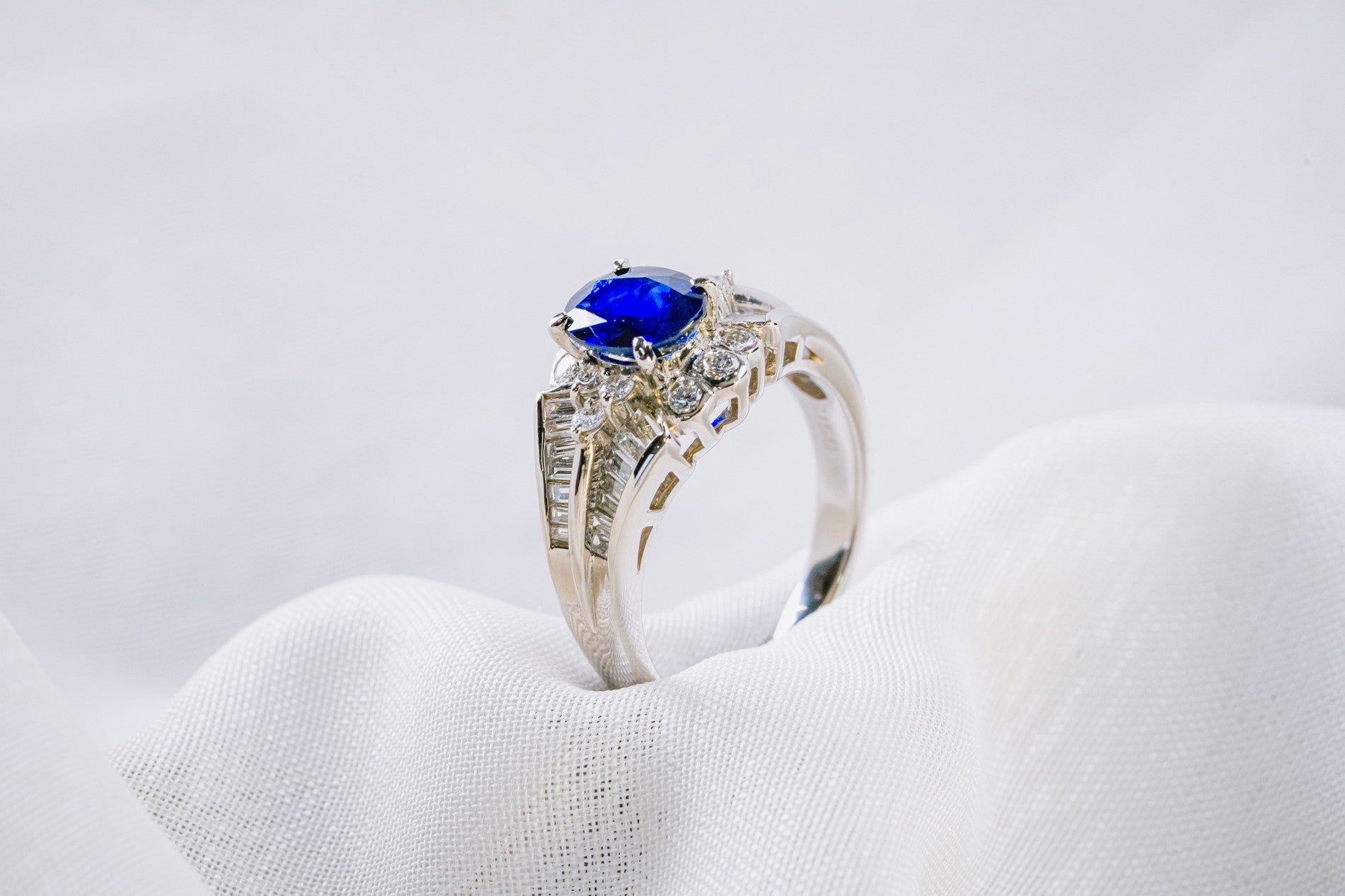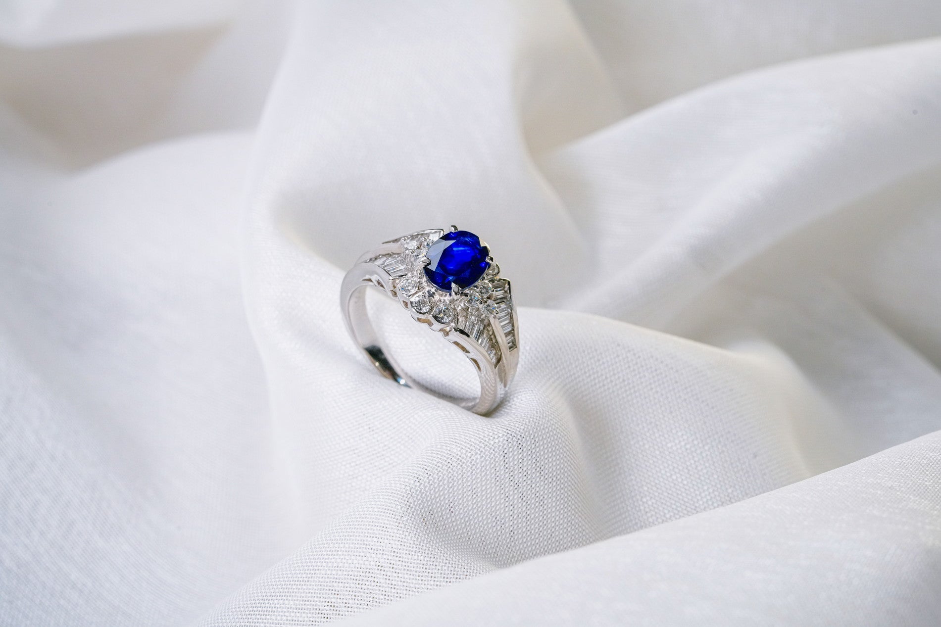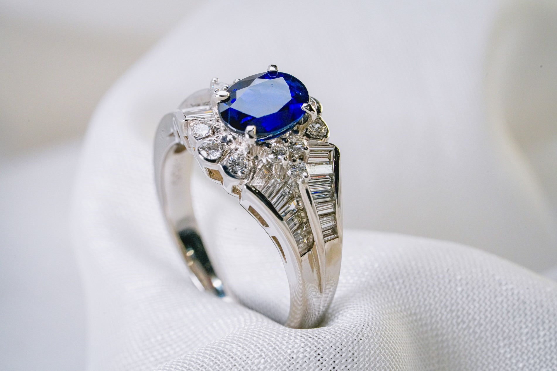 深く澄んだ青が印象的なオーバルカットのサファイアを主役に、煌めくダイヤモンドを両脇に配した、上品で華やかなリング。
