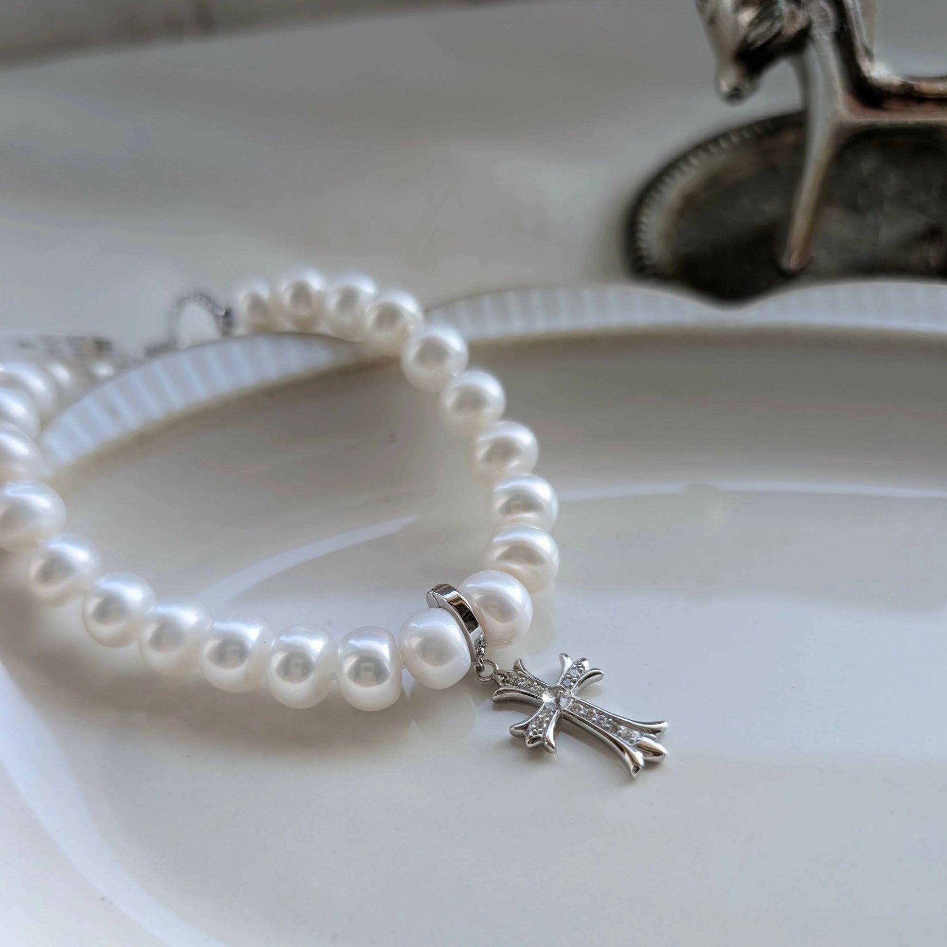 淡水真珠が繊細に輝くシルバー(S925)の十字架ブレスレット。16~17cmのサイズは手元を上品に彩り、かわいらしさと洗練された雰囲気を兼ね備えています。日常から特別な場面まで、優雅なアクセントとしてお使いいただけます。