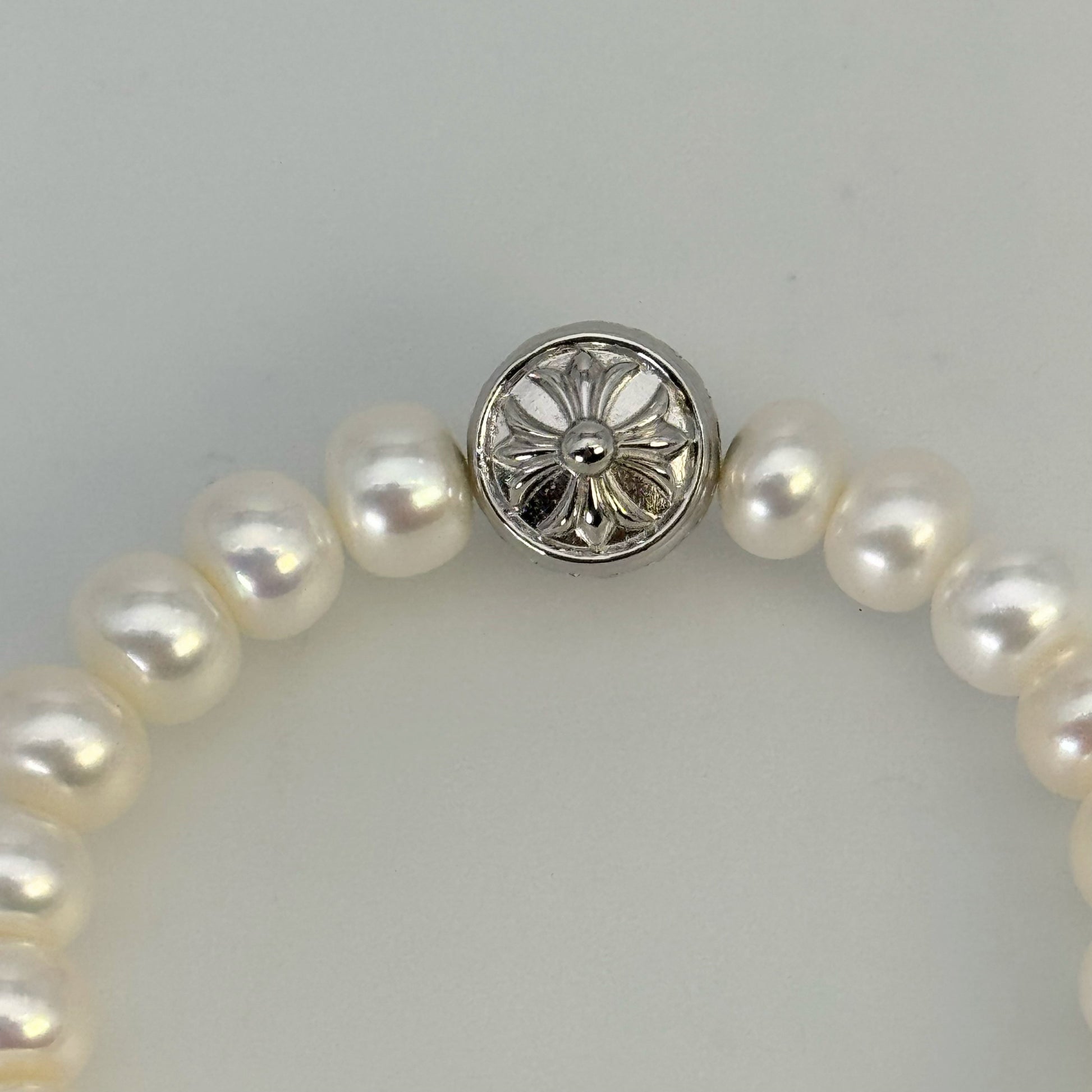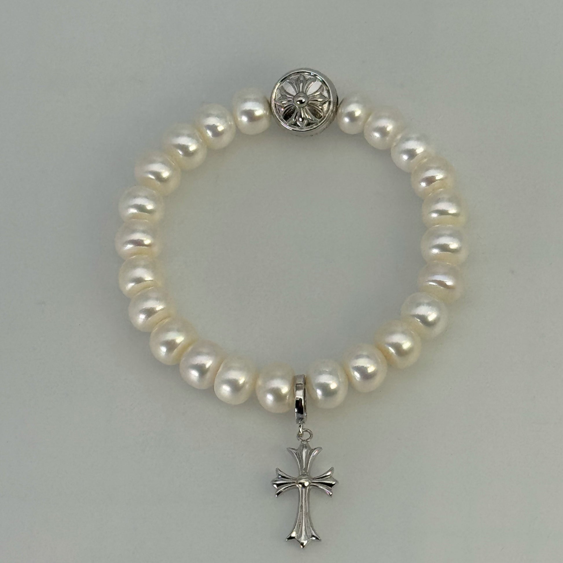 (JR-BR-0037) 淡水真珠 ホワイト 十字架 ブレスレット 16~17 cm S925