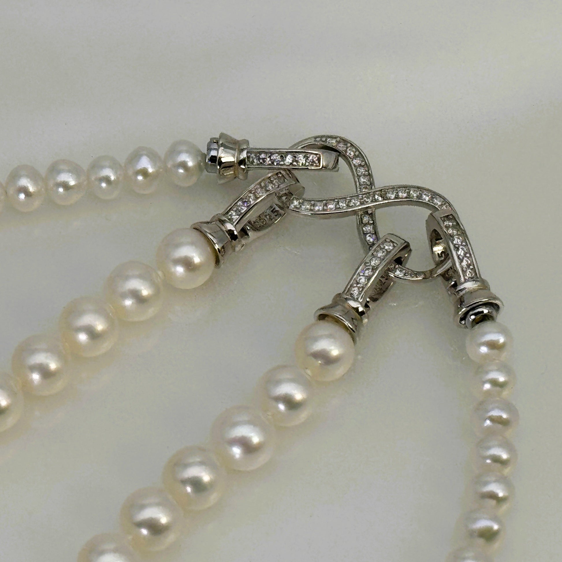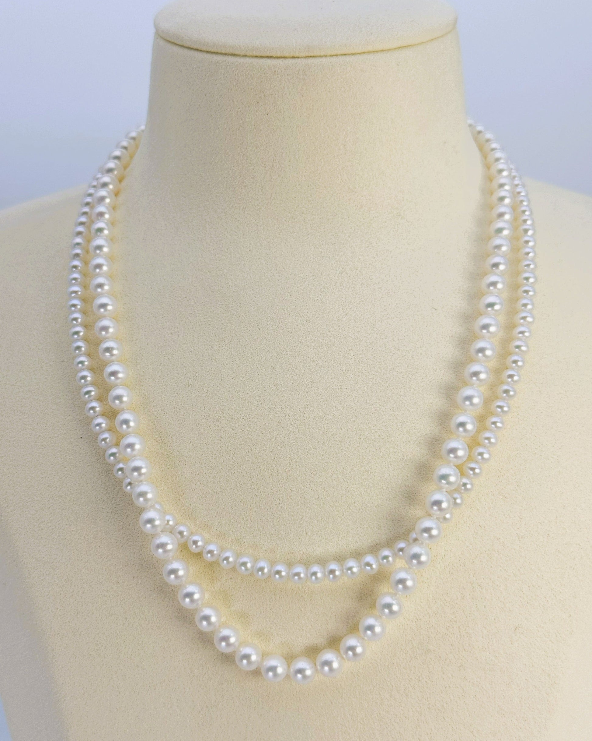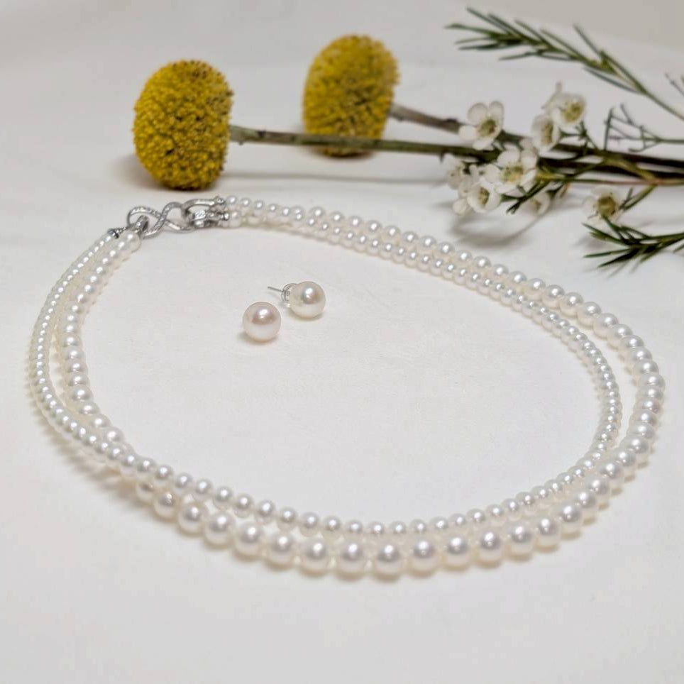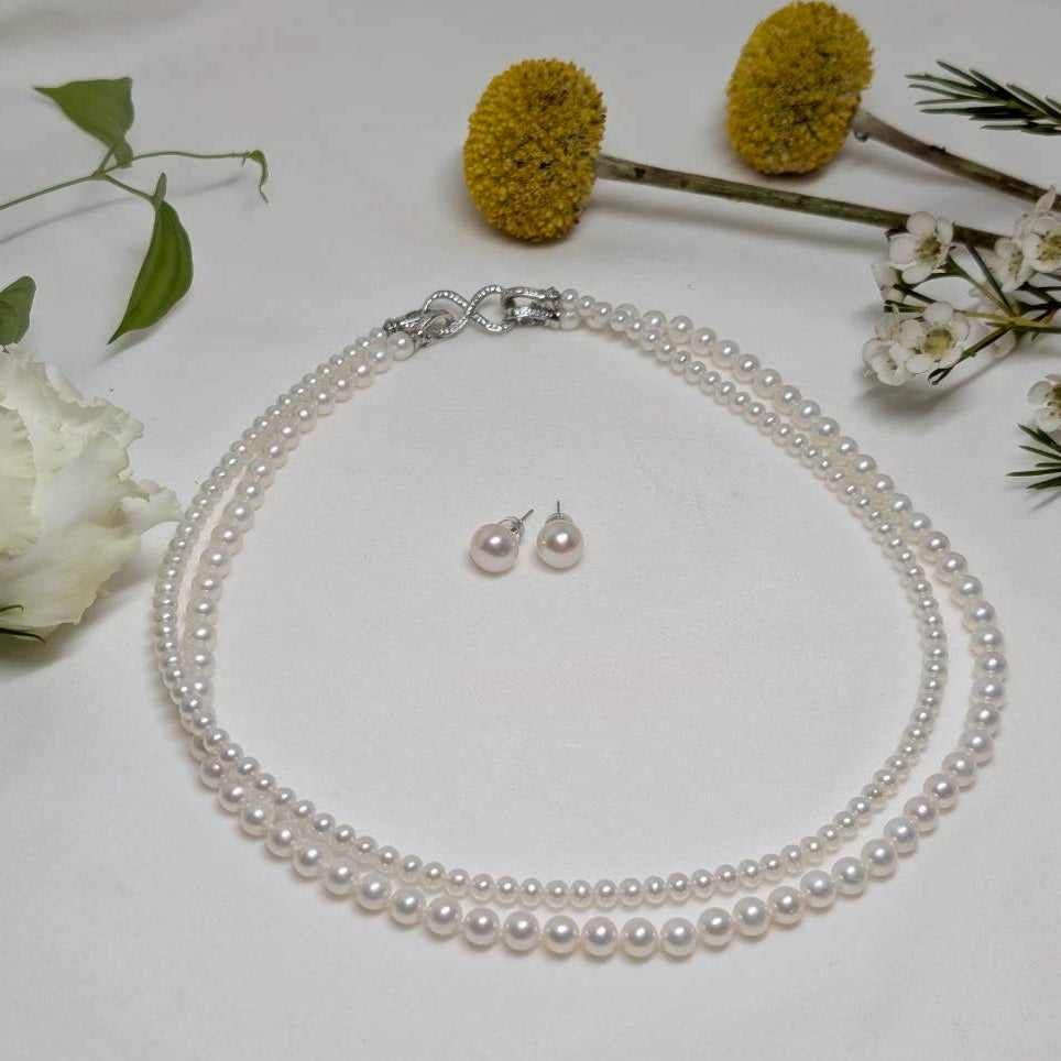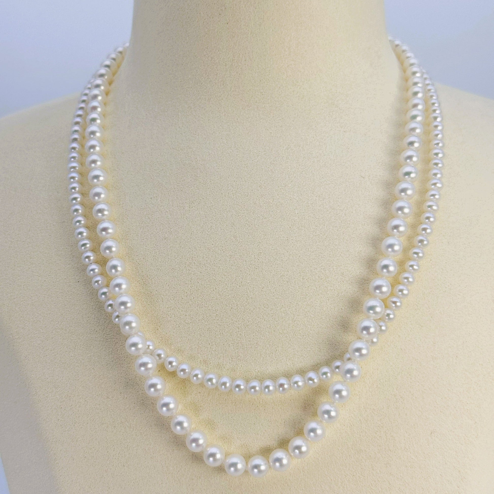 2つのサイズのホワイト淡水真珠を絶妙に組み合わせたネックレスは、優雅さと独創性を兼ね備えています。4.5mmと5.5mmの真珠が織りなす繊細なグラデーションが、洗練された印象を与えます。特別なシーンにふさわしい上品なアクセサリーとしておすすめします。