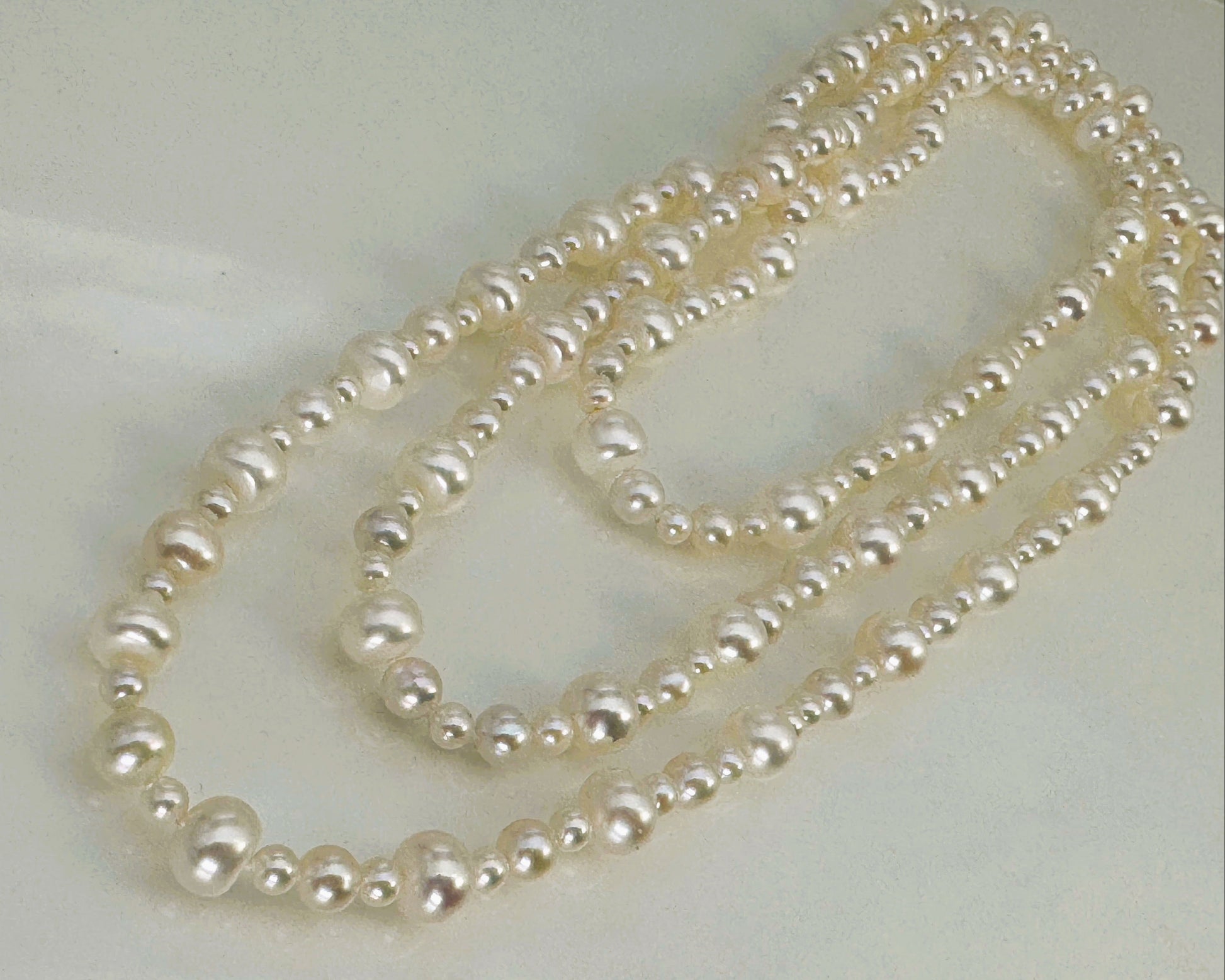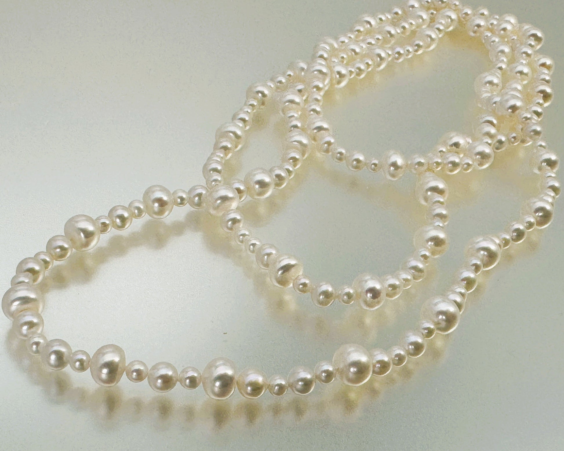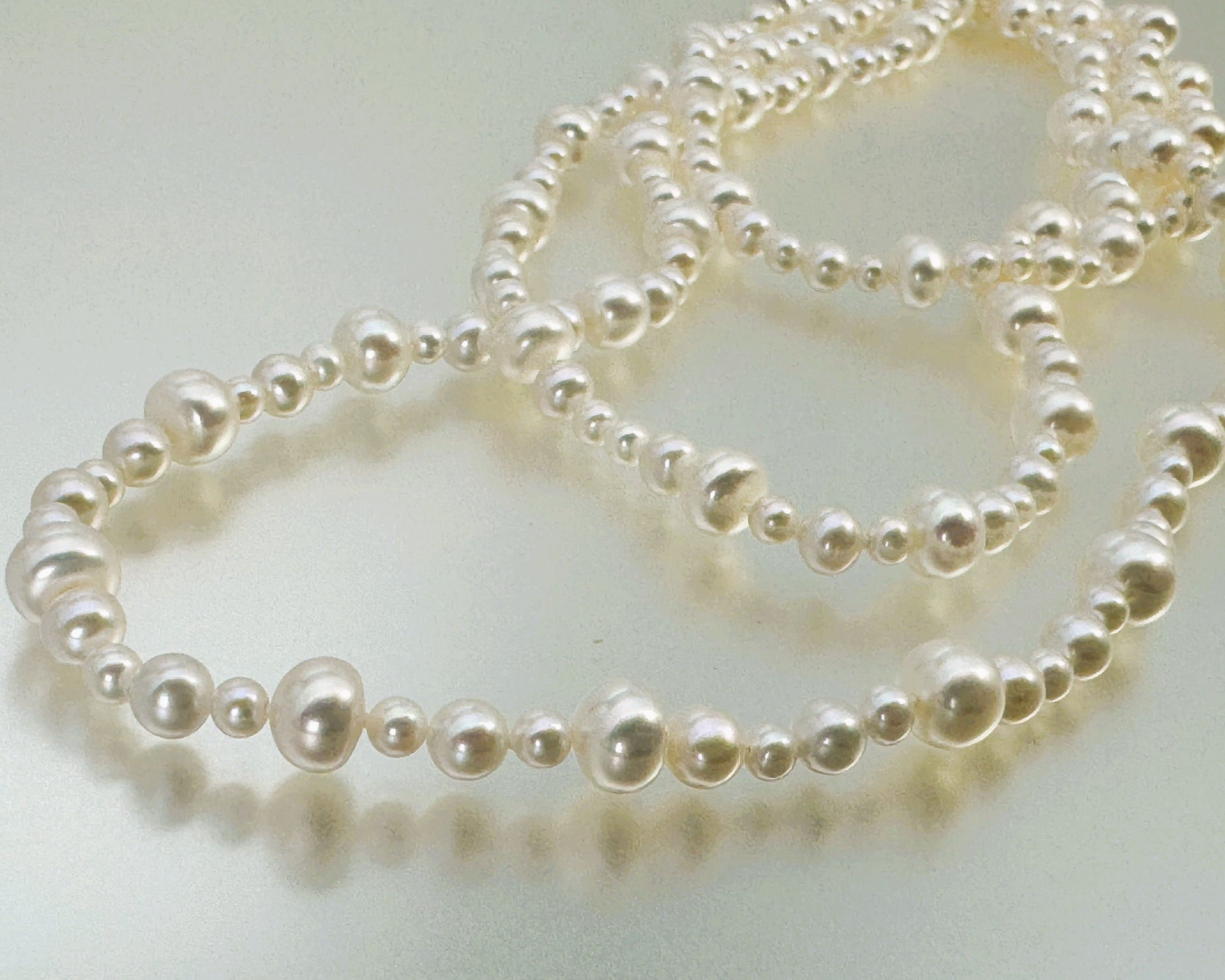ホワイトの淡水真珠を贅沢に使用した全長120cmのネックレスは、その長さと独特の存在感で洗練された印象を演出します。8.0~8.5mmの大粒真珠が連なるデザインは、シンプルながらも堂々たる美しさを放ち、さまざまな装いにエレガントさを添えます。特別な場面での装いに最適な、上質で個性的なアクセサリーです。