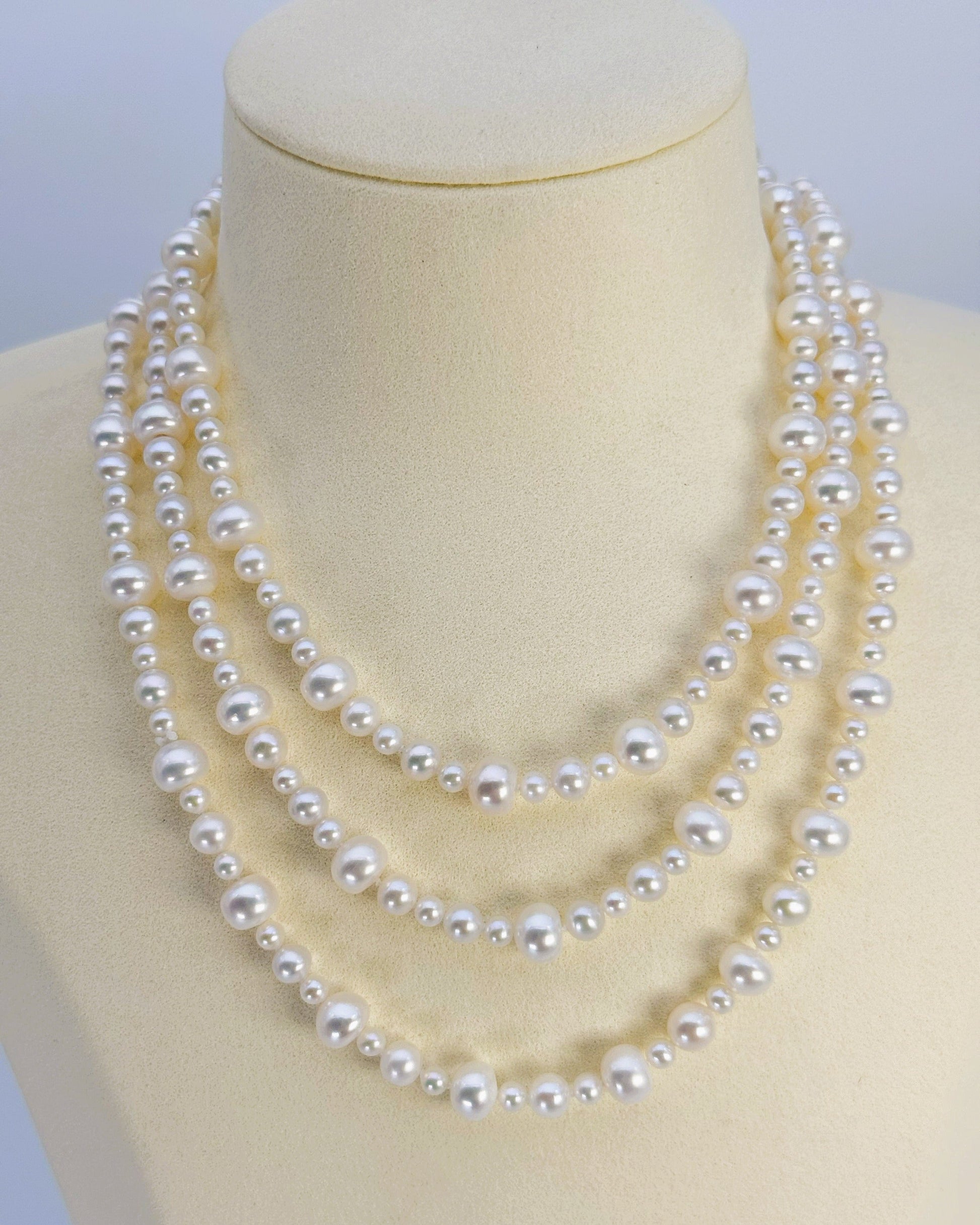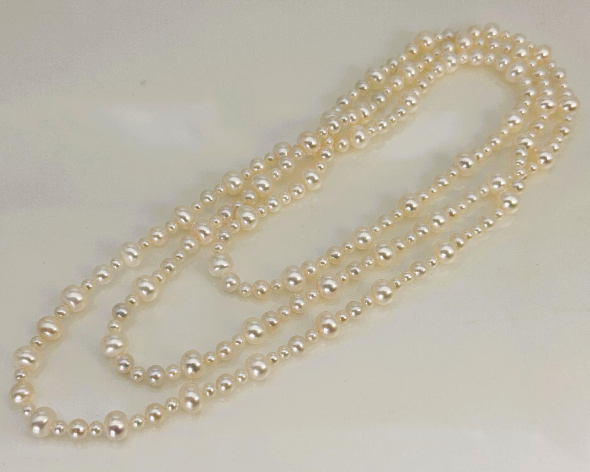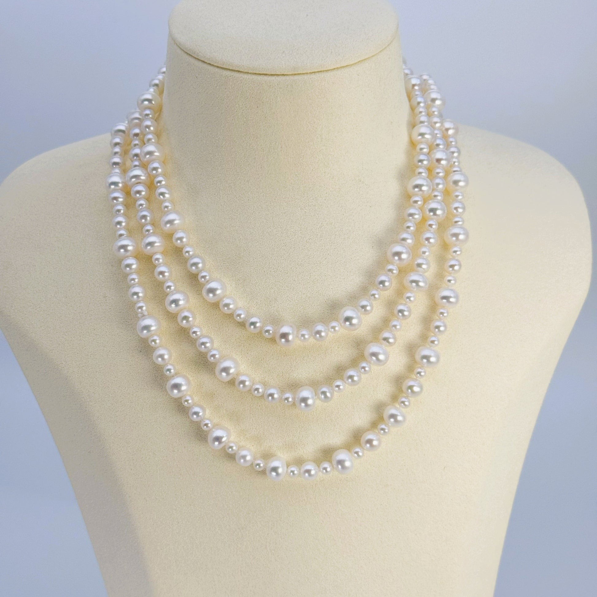 ホワイトの淡水真珠を贅沢に使用した全長120cmのネックレスは、その長さと独特の存在感で洗練された印象を演出します。8.0~8.5mmの大粒真珠が連なるデザインは、シンプルながらも堂々たる美しさを放ち、さまざまな装いにエレガントさを添えます。特別な場面での装いに最適な、上質で個性的なアクセサリーです。