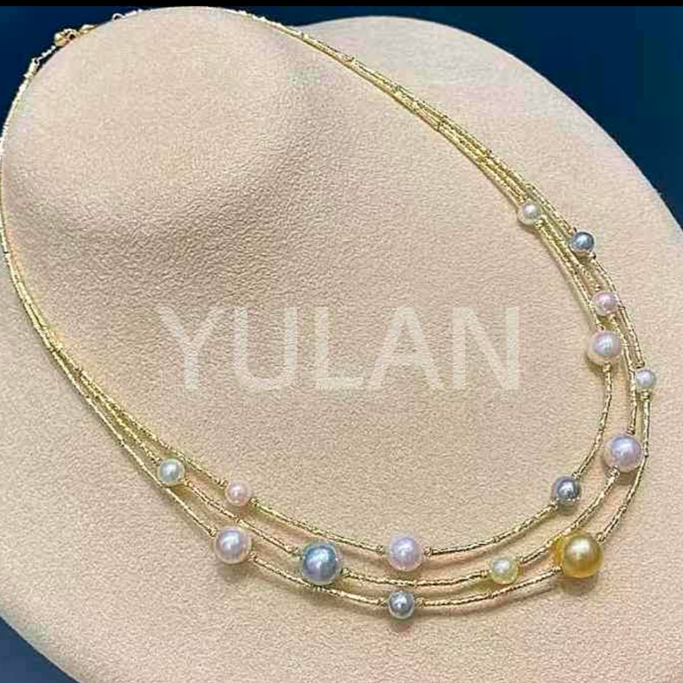 18Kホワイトゴールド素材のチェーンに、上質なホワイト、グレー、ゴールドのアコヤ真珠をあしらったネックレス。シンプルながらも気品あふれるデザインで、日常から特別なシーンまで幅広く活躍します。細部にまでこだわった仕上がりが、さりげない華やかさを添え、大人の女性にふさわしい逸品です。