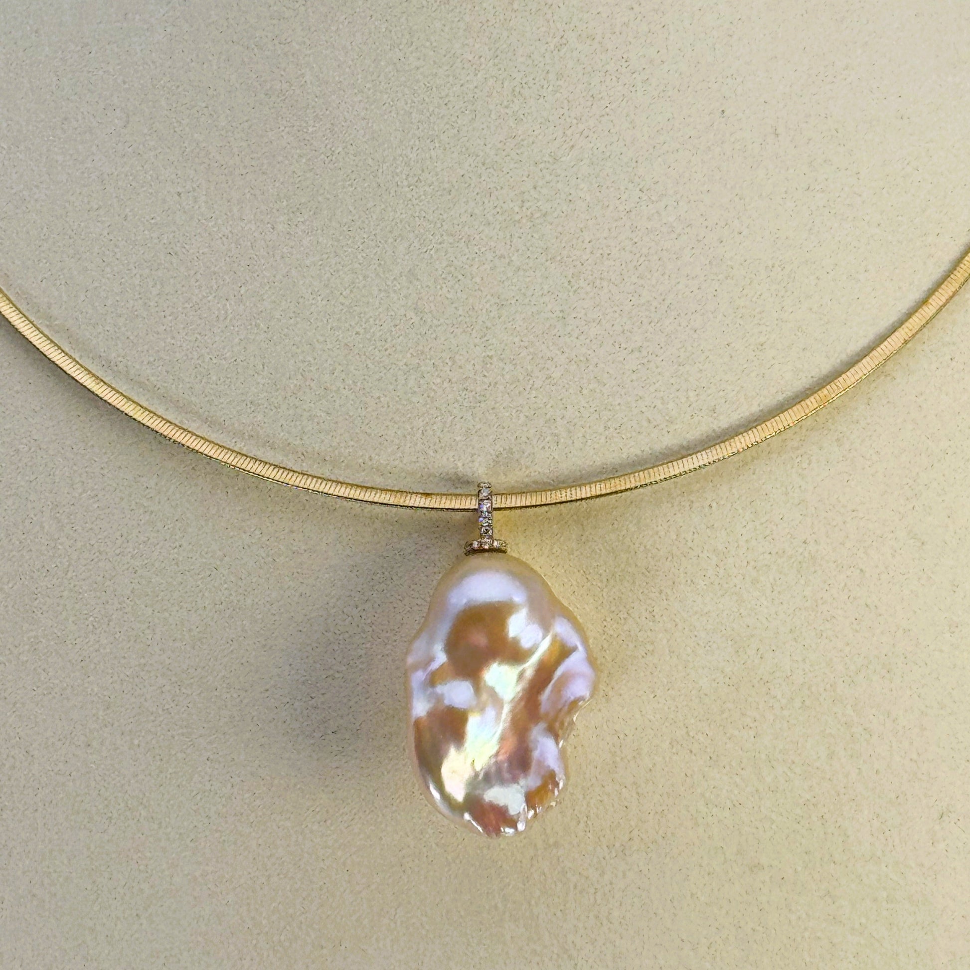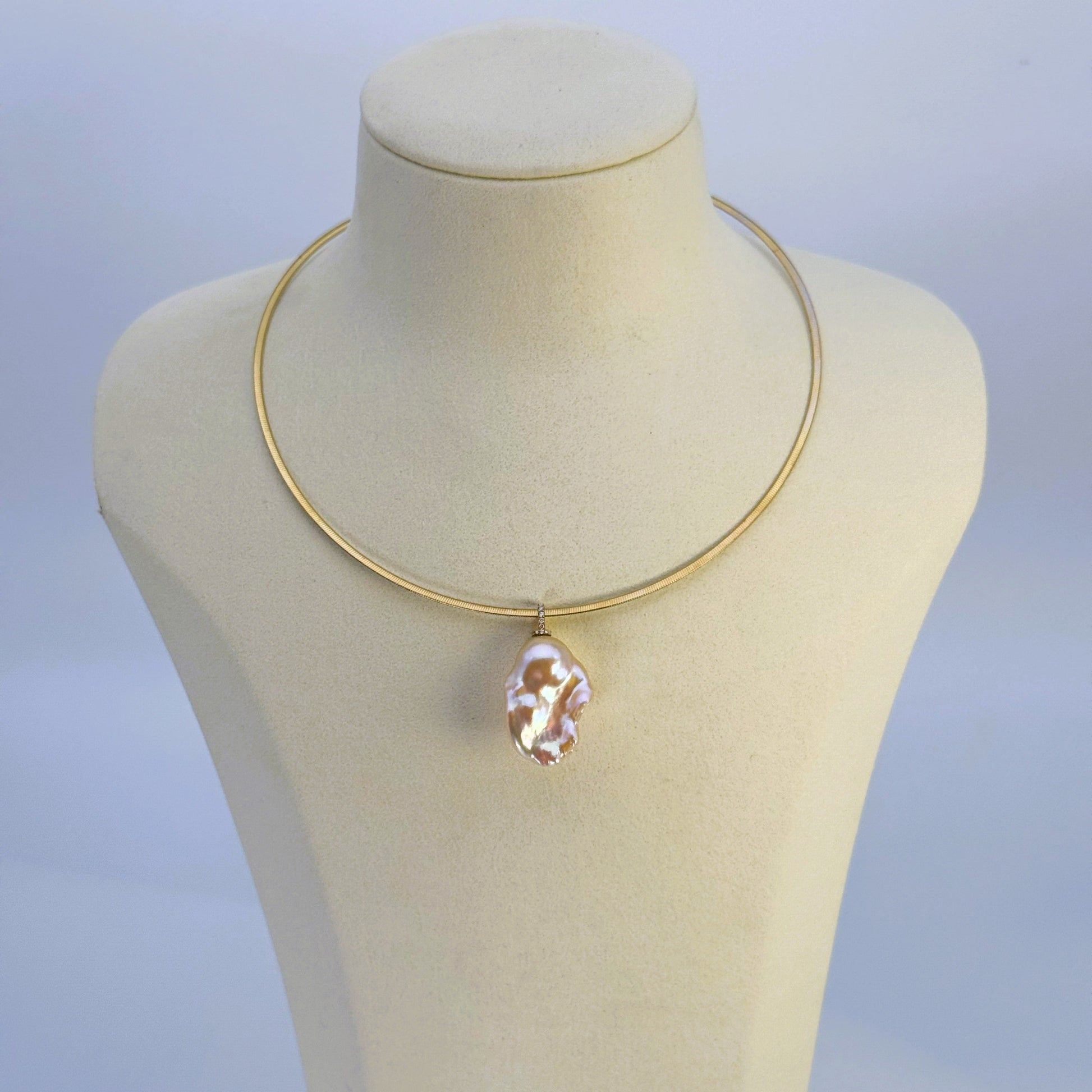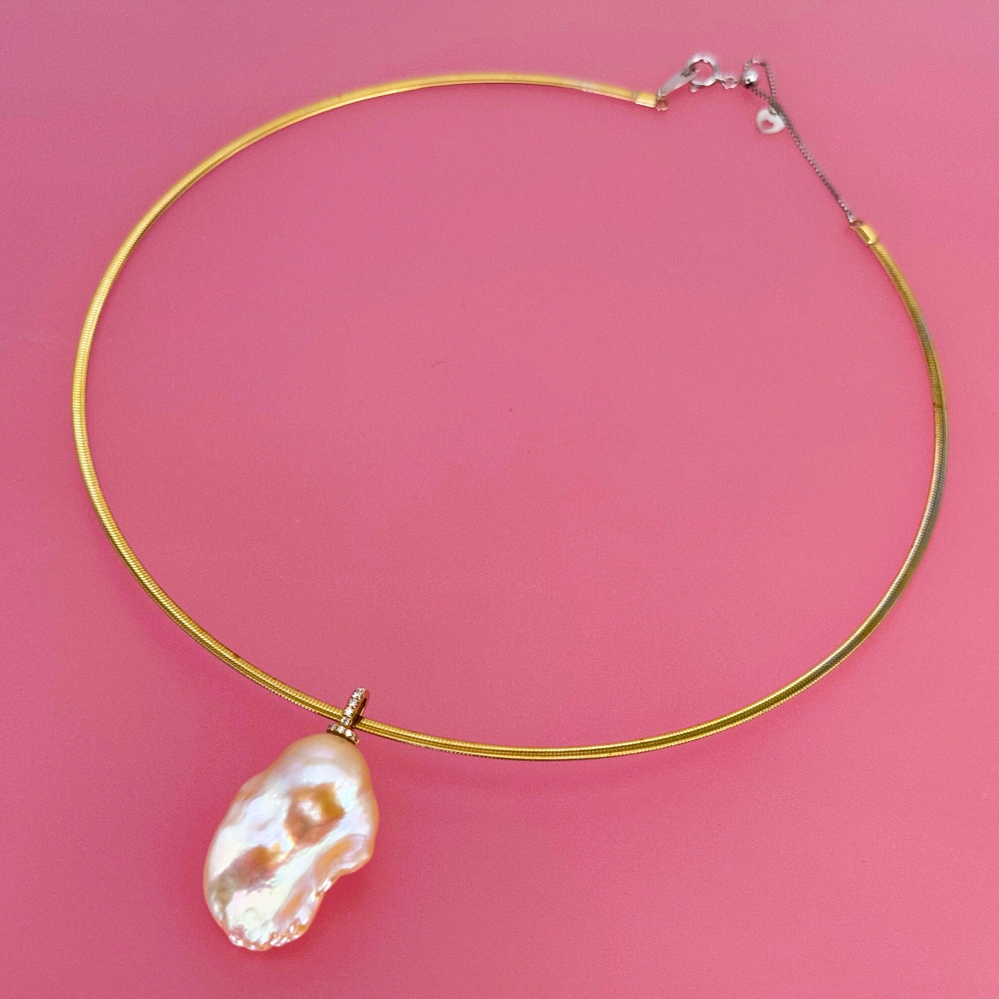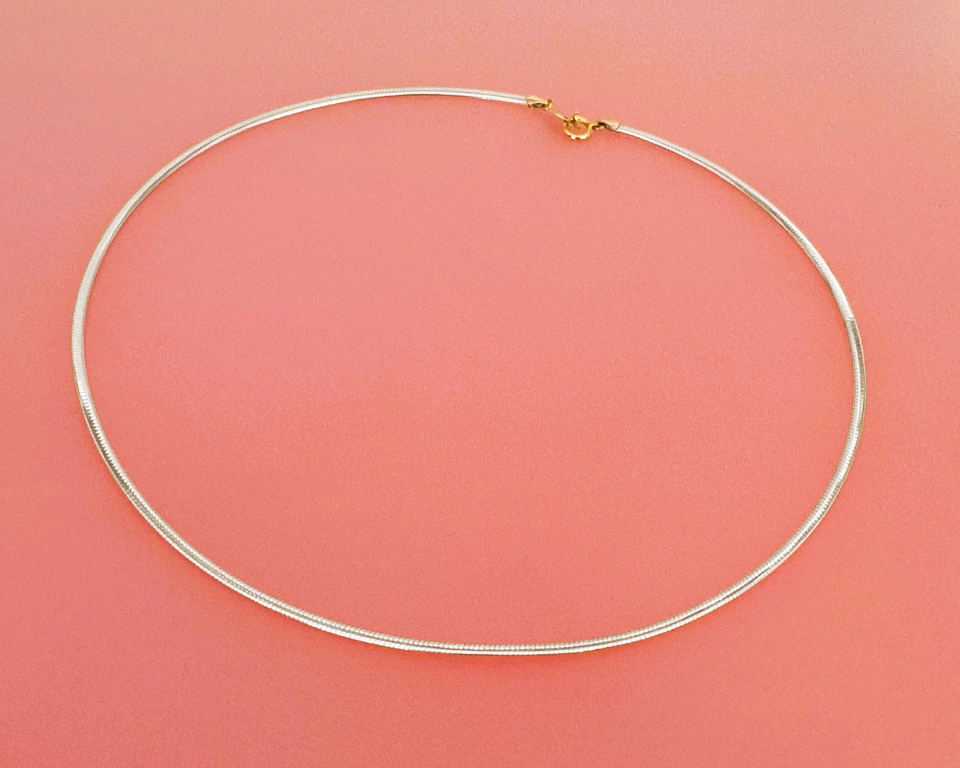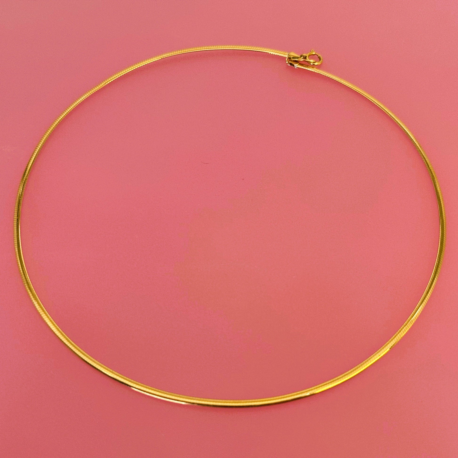K18のオメガネックレスは、リバーシブル仕様で異なる色を楽しめる洗練されたデザインです。太さが異なる2種類(2.0mm, 3.0mm)をご用意しており、好みやシーンに合わせて選べるため、幅広いスタイリングに対応します。長さは42.0cmで、上品な輝きが首元を美しく飾ります。日常から特別な日まで、さりげなく華やかさを添える逸品です。
